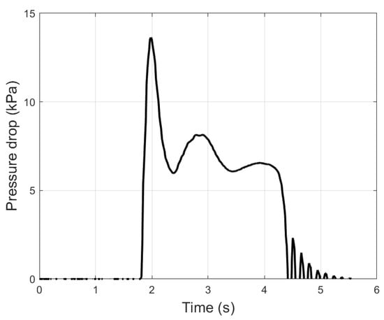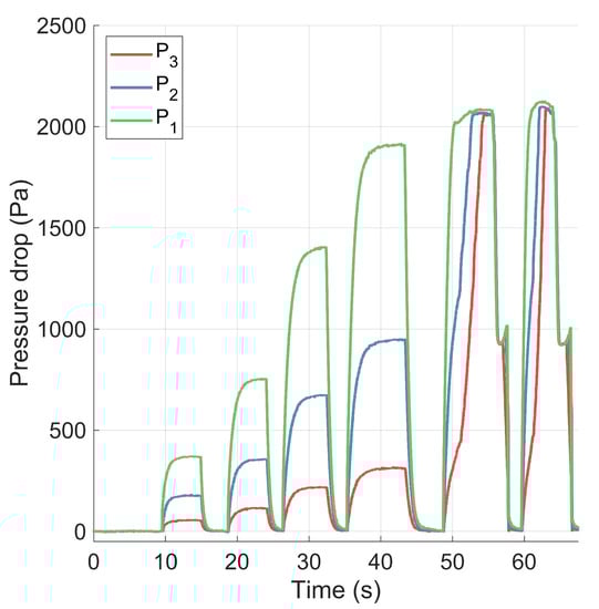 In order to study the behaviour of these materials during pneumatic conveyance, the pressure drop and aeration time constant during batch-fed conveyance were investigated. The pressure drop of 4 kg cottonseeds was measured at a superficial air velocity of 7.23 m/s, as shown in Figure 16. The results indicate that the pressure drop initially increased, then decreased to a relatively steady-state condition, and lastly returned to zero once the material had exited the pipe.