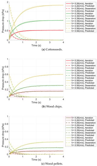 Figure 8 illustrates an instance of curve fitting applied to the aeration and deaeration pressure drop data for cottonseeds, wood pellets, and wood chips. As evidenced by the figures, there was excellent agreement between the exponential fitted curve, and the aeration and deaeration pressure drop data.