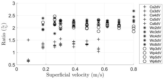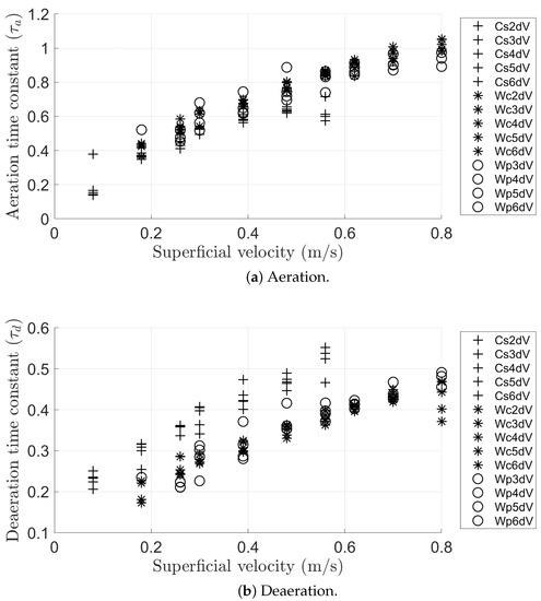Figure 9 reveals an increase in the time constants for both aeration and deaeration processes as the superficial velocity was heightened. This trend could be attributed to the mathematical expressions of Equations (11) and (13) that were formulated to describe the aeration and deaeration phenomena, respectively. These equations demonstrate that the time constant is proportional to the permeability of the material. Therefore, escalation in the air superficial velocity caused an upsurge in the pressure drop over the bed, consequently leading to an increase in the time constants for both aeration and deaeration. Although the time constants provide some insights, they are not unique values and may not be sufficient for a thorough material characterisation. Nevertheless, given the similar aforementioned trends observed in both aeration and deaeration, the ratio of aeration to deaeration time constants could serve as a potentially effective parameter for material characterisation, and can be written as follows:
