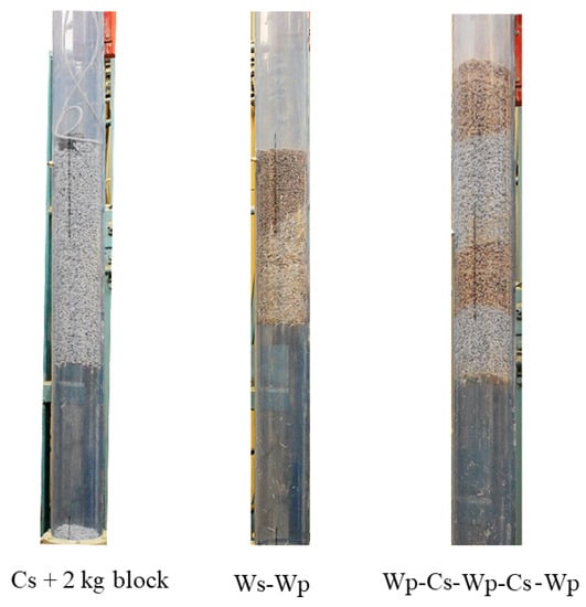 In this section, the results of the aeration and deaeration tests are presented, along with the analysis of the potential flow modes for all four materials. Possible flow regimes for cottonseeds were recently presented by Rajabnia et al. [39], and the same procedures were applied to the other materials, namely, wood chips, wood pellets, and wheat straw. Observations indicate that plugs could be formed by all materials, although the minimal required superficial velocity of air to mobilise the bed of material varied. Moreover, the probability and controllability of plug formation were higher for cottonseeds and wheat straw than those for wood chips and wood pellets. An illustration of a formed plug for wood chips, wood pellets, and wheat straw can be found in Figure 4.