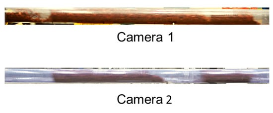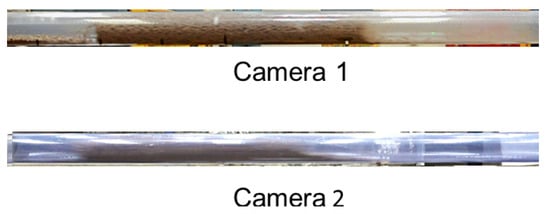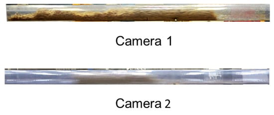 Upon examination of the experimental data, it was observed that cottonseed, wood chips, and wheat straw exhibited complete plug flow during pneumatic conveyance. Wood pellets initially demonstrated plug-flow behaviour, but later transitioned to a longer and more sluglike conveyance. Figure 12, Figure 13, Figure 14 and Figure 15 provide a visual representation of the conveying behaviour of all four materials, as recorded with Camera 1, situated at the pipeline’s front, and Camera 2, located at the pipeline’s end. The experimental observations revealed that cottonseed can be conveyed over a wider range of air supply, owing to its lower minimal conveying superficial velocity. Conversely, wood chips require nearly three times more air supply to be conveyed inside the pipeline. This finding was observed during the aeration and deaeration tests presented in the previous section.