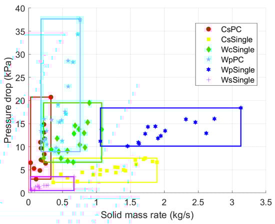 The results for the time constants can be better understood and analysed when complemented with the pressure drop data. This comprehensive approach allows for a more complete evaluation of the system’s performance. Consequently, Figure 17 presents the pressure drop for all tests in the single-batch and continuous conveyance of all materials as a function of the solid mass rate. “Single” and “PC” denote single batch and continuous pneumatic-conveyance tests, respectively, while “Cs”, “Wc”, “Wp”, and “Ws” represent cottonseed, wood chips, wood pellets, and wheat straw, respectively.
