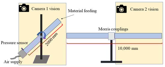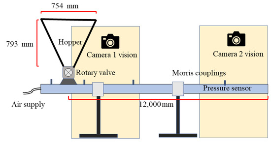 A part of this study employed a pneumatic conveying test rig that was specifically developed for conducting single-batch conveying evaluations. This experimental setup is characterized by its flexibility and is composed of a transparent PVC pipeline, which is 101.6 mm (4 inches) in diameter and spans 12 m in length. This feature permits unobstructed visual observation of the material’s behavior throughout the transportation process. As illustrated in Figure 2, in order to improve the efficiency of material feeding in the system, we have introduced a mechanism within the first two meters of the pipeline. This mechanism involves a rotatable 2-m segment of the pipeline through which the material is loaded. The key feature of this mechanism is its ability to smoothly rotate the pipeline segment from a horizontal position to a vertical position during the loading process. Once the loading is complete, the segment is returned to its original horizontal position and securely reconnected to the rest of the pipeline using Morris couplings.