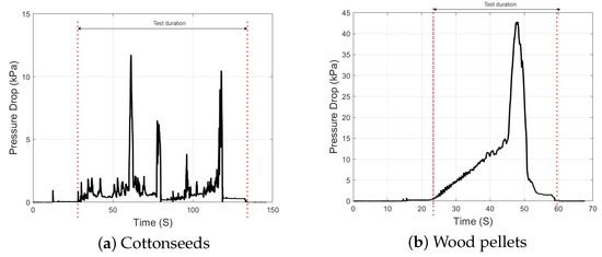 The approach for selecting the measured pressure drop varied between the continuous pneumatic conveying tests performed on cottonseed and wood pellets. Although both materials exhibited plug flow, cottonseed plugs formed over shorter lengths but in greater numbers per test compared to wood pellets. For wood pellets, at the pipeline’s beginning, particles were observed to roll and form a longer layer of material, resulting in the rear of the plug’s formation, which subsequently moved as a lengthy plug within the pipe. Consequently, the pressure drop trend for cottonseed was characterized by multiple pulses allocated to each formed plug. In contrast, for wood pellets, a linear increase in pressure drop was observed until the plug formation. Once the plug was in place, a single pulse of pressure drop was observed until the plug exited the pipe. Based on these observations, the measured pressure drop for wood pellets and cottonseed was determined as the maximum peak of pulses within the pipeline. This procedure is shown in Figure 5.
