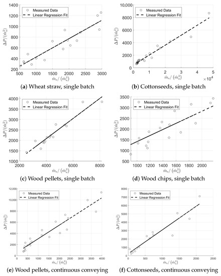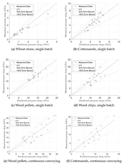 The results from the single batch feeding test series presented in Figure 6a–d indicate that all four materials exhibit a degree of linearity. However, the observed linearity is superior for cottonseeds and wood pellets compared to wood chips and wheat straw. This outcome is in line with the existing understanding that biomass materials possess unique characteristics such as irregular and heterogeneous shape [54]. In particular, wood chips and wheat straw are considered to be the most extreme in this regard, exhibiting a significantly greater particle size distribution and a less consistent particle shape [38]. The literature [55] suggests that high wall pressures, manifested as large fluctuations in pressure, are associated with fewer particle contact points. Therefore, it is plausible that the irregular shapes of wood chips and wheat straw result in fewer contact points with the conveying system walls, leading to an increased incidence of pressure fluctuations. The present analysis highlights that in the case of cottonseed and wood pellets, a higher degree of linearity is observed on the graph as the values approach the origin on the x-axis. This observation is attributed to the fact that in Equation (4), the denominator term containing results in lower x-axis values for higher air mass flow rates. Additionally, the conveying of materials through dense phase conveying is more stable at higher air mass flow rates, leading to a better linearity in the observed trends. Additionally, it is evident that wood pellets exhibit better agreement in pressure drop prediction. This can be ascribed to the conveying nature of this material, as it was observed to convey in a manner more akin to slug flow rather than piston-like plug flow. Consequently, the contact area between the particles and the pipe wall is smaller compared to the other materials, resulting in reduced frictional forces from the wall. Thus, the recorded pressure drop is closer to the final steady-state condition rather than that of the other materials. Moreover, it is apparent that wood pellets demonstrate better alignment in pressure drop prediction. This can be attributed to the conveying characteristics of this material, as it was observed to convey in a manner more similar to slug flow rather than piston-like plug flow, and its highest bulk and particle density compared to the other materials. As a result, the contact area between the batch of wood pellets and the pipe wall is smaller compared to the other materials, leading to decreased frictional forces from the wall.