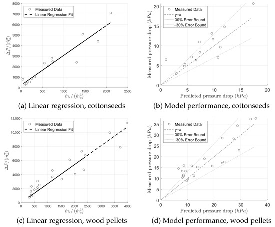 The results presented in Figure 8 demonstrate that there was no significant difference in the linear fit when forcing it to pass through the origin. However, it should be noted that the proposed model is more likely to underestimate the pressure drop when the intercept value is forced to zero, as it does not consider the contribution of gas pressure drop inside the system. Despite disregarding the a coefficient, the model still operates effectively. It is worth noting that the boundary conditions of the linear fit require that both constants must be positive, while the intercept can be zero.
