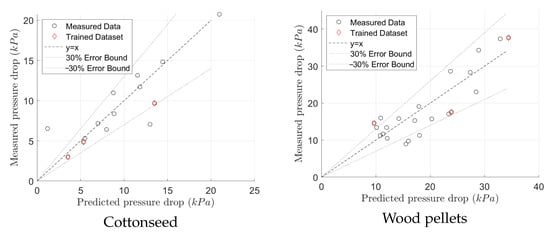In order to evaluate the efficacy of the model, the obtained regression constants must be applied to the model to calculate the pressure drop. The resultant predicted pressure drop is then compared to the actual measured values, as depicted in Figure 7. Within a range of 30% error, it is evident that the model aligns well with the empirical data, thereby indicating a satisfactory level of agreement between the predicted and actual pressure drops.