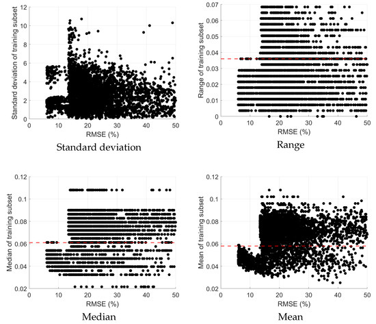 An investigation is conducted to examine the relationship between the key descriptive statistics of the training subsets, namely standard deviation, range, mean, and median, and the RMSE error. The findings are presented in Figure 11, which offers insights into the connection between the training data’s statistical characteristics and the performance of the model. As observed from the results, there is a notable shift when the error is approximately 15%. This point is taken as a reference to identify patterns, and the red solid lines demarcate the values of range, median, and mean of subsets that have an error exceeding the reference value. The percentage of points above the red line is subsequently computed.