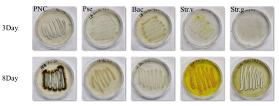 Considering the microorganisms in the tomb and cave paintings, we selected Penicillium flavigenum, Pseudomonas citronellolis, Bacillus sporothermodurans, Streptomyces vinaceus, and Streptomyces griseolus for irradiation experiments. The five microorganisms were abbreviated as PNC, Pse, Bac, Str.v, and Str.g. The strains were provided by researchers from the Environmental and Health Group of the Chinese Academy of Sciences [30].