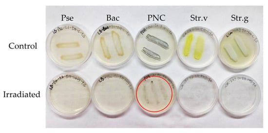 Usually, the effectiveness of radiation decontamination is related to the type and the quantity of the microorganism, as well as temperature, humidity, oxygen, and other factors [18]. According to the results, a dose of 5 kGy already removes most microorganisms, which shows the excellent disinfection ability of irradiation technology. There were 4 bacterial species (Bac, Pse, Str.g, Str.v) that did not regrow after being exposed to 20 kGy of radiation in our experiment. Both Streptomyces species were eliminated at all doses, showing low resistance to irradiation. The fungus Penicillium flavigenum was not removed at a dose of 10 or 20 kGy and simply showed growth resistance (Figure 2, PNC, Red circular). After 30 days, eliminated bacteria did not regrow in the medium. These results showed that irradiation technology can efficiently reduce microbial contamination and give support for subsequent protective efforts.