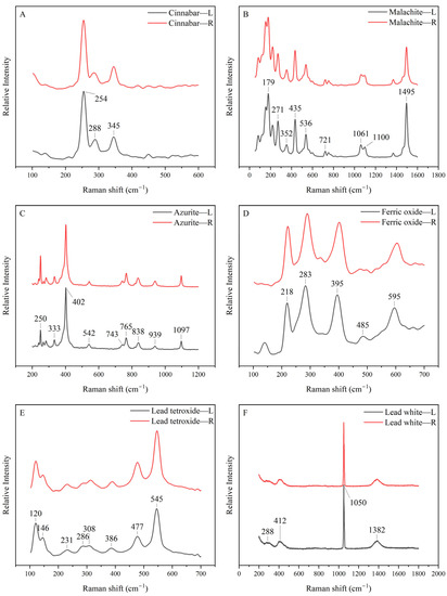 The Raman spectra of the six unirradiated and irradiated pigments are shown in Figure 4. “L” represents the unirradiated pigment on the left side of the mural block, and “R” represents the pigment irradiated at 20 kGy on the right side. The Raman shifts of the main peaks are labeled in the figure. The Raman spectrum of cinnabar exhibits three characteristic major bands at 256, 287, and 346 cm−1 [46]. The Raman bands of malachite show at 180, 219, 270, 355, 434, 538, 721, 1067, 1100, and 1493 cm−1 [47]. The Raman bands of azurite are 249, 401, 765, 838 and 1096 cm−1 [48]. The ferric oxide shows Raman bands at 223, 243, 292, 406, 495, and 609 cm−1 [47], and our results deviate from them by no more than 10 cm−1. Furthermore, the “L” curve (Figure 4D), after smoothing, shows a small peak on the far left side, which does not appear in the “R” curve, nor in the tests of others. We speculate that these variations are because the ferric oxide samples, out of the six pigments, had the worst signal-to-noise ratios at 473 nm excitation. And lead tetroxide with corresponding bands at 122, 153, 224, 314, 392, 480, and 550 cm−1 [49]. Lead white has characteristic Raman bands at 417 and 1049 cm−1 [50]. Our results are basically consistent with the data in these studies.