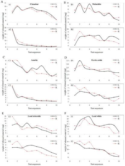 In Figure 5, the two sets of curves are intertwined in most cases and are not clearly separated, which supports the finding that the differences in released material in Table 3 are not large. Even though the ΔM for the cinnabar group was 25.24%, the two curves are still very similar, as can be seen in C2 of Figure 5, with the main difference originating from the first two releases. B2 in Figure 5 represents the lead tetroxide of the treatment group, and the “R” curve represents the irradiated part, which is consistently lower than the “L” curve representing the unirradiated part after the third test, which may be the reason for the difference in this group. However, the downward trend of the two curves is almost identical. To sum up, it can still be considered that irradiation treatment will not have a significant impact on the surface cohesion of the pigment layers of the mural blocks. (Detailed data can be obtained from the Supplementary Materials).