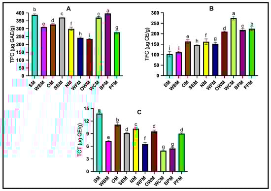 The estimation of phenolic content of ten kinds of mushrooms. (A) Total phenolic content (TPC). (B) Total flavonoids content (TFC). (C) Total condensed tannin content (TCT). The data presented represent the mean ± standard deviation of three replicates from accession. ANOVA and Tukey’s test were used to determine the statistically significant difference at p < 0.05 as identified by different letters. The codes for the mushroom samples are as follows: SM: shiitake mushroom; WBM: white button mushroom; OM: oyster mushroom; SBM: Swiss brown mushroom; NM: needle mushroom; WFM: white flat mushroom; OWM: organic white mushroom; WCM: white cup mushroom; BPM: brown portobello mushroom; PFM: portobello flat mushroom.