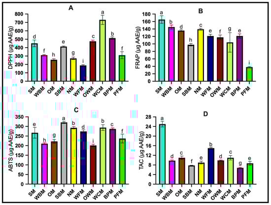 The estimation of antioxidant potential of ten kinds of mushrooms. (A) 2,2-diphenyl-1-picrylhydrazyl (DPPH). (B) Ferric reducing antioxidant power (FRAP). (C) 2,2′-azino-bis-3-ethylbenzothiazoline-6-sulfonic acid (ABTS). (D) Total antioxidant capacity (TAC). The data presented represent the mean ± standard deviation of three replicates from accession. ANOVA and Tukey’s test were used to determine the statistically significant difference at p < 0.05 as identified by different letters. The codes for the mushroom samples are as follows: SM: shiitake mushroom; WBM: white button mushroom; OM: oyster mushroom; SBM: Swiss brown mushroom; NM: needle mushroom; WFM: white flat mushroom; OWM: organic white mushroom; WCM: white cup mushroom; BPM: brown portobello mushroom; PFM: portobello flat mushroom.