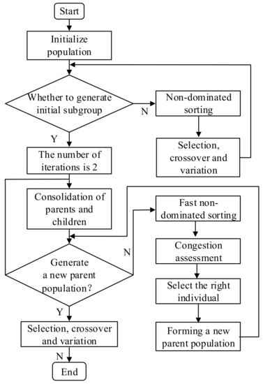 The SGA algorithm encodes the problem space parameters, converts them into binary codes, and then initializes the population. Then, the fitness function, selection operator, and cross-mutation are used for calculation. When the number of evolution iterations reaches the termination condition, or the individual optimal value has been found, the algorithm operation is completed. However, when solving the multi-objective problem, there is an interaction relationship between the sub-objectives. The SGA algorithm is difficult to ensure the balance between the different sub-objectives by finding the optimal solution globally. Therefore, the research selects the non-dominated sorting genetic algorithms (NSGA), which are suitable for a high-dimensional, multi-objective solution to solve the model to obtain the Pareto optimal solution. The NSGA-II algorithm, with an elite strategy, can effectively reduce the complexity of computation compared to the NSGA algorithm. It has good performance in low-dimensional optimization problems. The solution set has good distribution, high operation efficiency, and good application in the optimization of two-objective problems. Figure 3 shows the flow diagram of the NSGA-II algorithm.