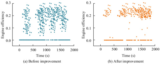 Figure 5 shows that before applying the multi-objective optimization algorithm, the working efficiency of the engine changes in varying degrees with the increase in working time. The adjustment of working points is large. After algorithm improvement, the working points of the engine are mostly concentrated in the high-value area, which effectively reduces the energy consumption and improves the efficiency by 13.25%.