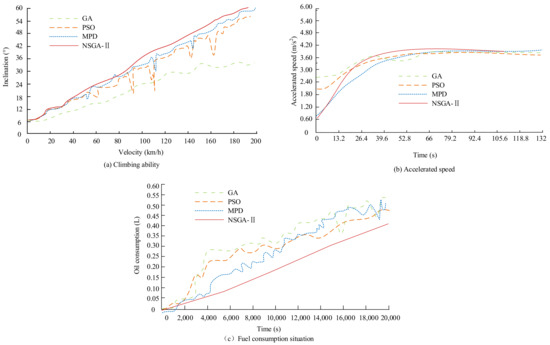 The results in Figure 8 indicate that, in terms of climbing ability, the performance of the four algorithms from large to small is: NSGA-II > MPD > PSO > GA. Among them, the average number of climbing degrees of the PSO algorithm and the GA is small at different driving speeds, and the overall node fluctuation is more obvious. Although the MPD algorithm performs well and the overall curve changes smoothly, its climbing curve slope is smaller than the NSGA-II proposed in the study. In terms of vehicle acceleration status, the NSGA-II algorithm and MPD algorithm spend less time on acceleration improvements, and the overall performance is relatively stable. When the time is greater than 13.2 s, the NSGA-II algorithm still has a different amplitude of 0.64% compared to the MPD algorithm. In terms of fuel consumption, the proportion of fuel consumption for the four algorithms varies from high to low: GA > PSO > MPD > NSGA-II. The overall fuel consumption of the NSGA-II algorithm proposed in the study is relatively low, and there are fewer fluctuations under power acceleration. The above results indicate that the NSGA-II algorithm can achieve energy consumption optimization while retaining the power of the vehicle and maintaining a relatively stable driving state of the power vehicle.