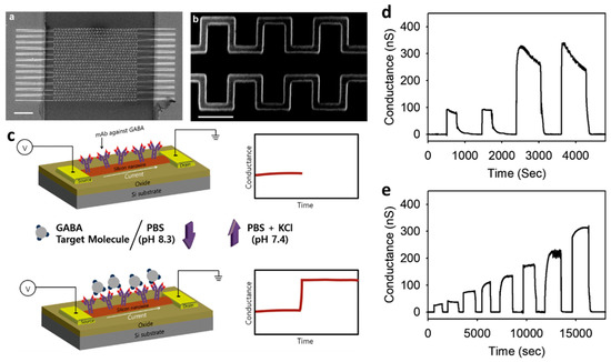 Generated nanowire pattern on SOI wafer as seen in the scanning electron microscope image in (a,b) device schematic for a field effect transistor based on silicon nanowires to detect GABA (scale bars: 5 m, 500 nm). (c) This system’s conductance increased when GABA was added as a result of an immunoreaction, which was observed using a FET device based on silicon nanowires. (d) A reproducible conductance signal is seen through certain GABA molecule concentrations. (e) After using the GABA target molecule, the conductance versus time measurements on the GABA antibody-modified p-type silicon nanowire vary from 970 fM to 9.7 µM. Reproduced with permission from [40]. Copyright 2019 Springer.