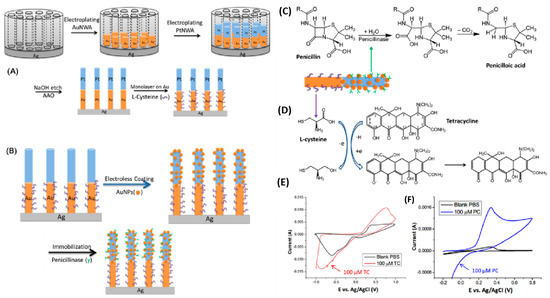 The manufacturing of nanowire of Au–Pt multi−segment assembly: L−cysteine on the Au is shown schematically in (A); electroless plating of Au NPs on Pt region followed by the enzyme of penicillinase (B); the sensing mechanisms of penicillinase and penicillin (C); L−cysteine and tetracycline (D). Cyclic voltammetry of the nanowire arrays of (E) Au(L−cysteine) sensing 100 μM tetracycline (1 mM PBS) and (F) Pt (Penicillinase) detecting 100 μM penicillin (1 mM PBS). Reproduced with permission from [36]. Copyright 2019 Elsevier.