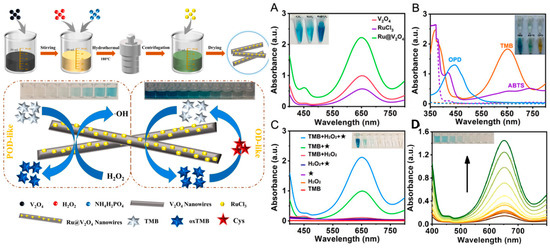 The synthesis of Ru@V2O4 NWs with good tetra-enzyme and the colorimetric sensor method for Cys and H2O2 are shown schematically (left image). The activity of catalysis of three distinct substances (RuCl3, V2O4 NWs, and Ru@V2O4 NWs) on TMB is shown in (A). (B) Spectra of UV-vis absorption of reactions catalyzed using Ru@V2O4 NWs, including OPD (blue line), ABTS (purple line), and TMB (yellow line). Individual ABTS, TMB, or OPD are shown by the accompanying dashed lines. Spectra of TMB, H2O, Ru@V2O4 nanowires, Ru@V2O4 nanowires/TMB/H2O2, Ru@V2O4 nanowires/TMB, TMB/H2O2, and Ru@V2O4 nanowires/H2O2, are shown in (C,D). Reproduced with permission from [37]. Copyright 2021 Elsevier.
