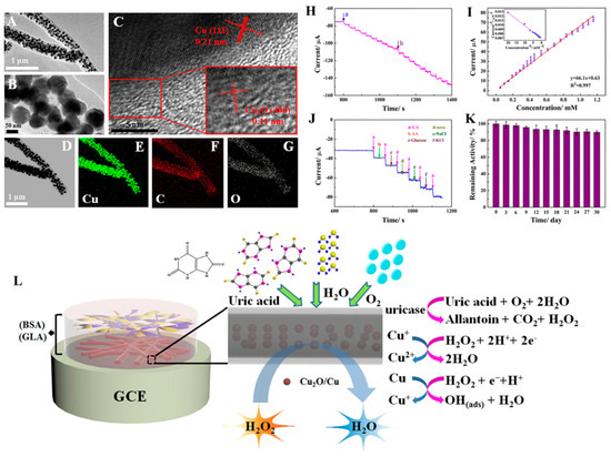 Core–shell Cu2O/Cu@C NWs are shown in: (A,B) TEM images, (C) HRTEM images, (D–G) images of EDX mapping, and (H) the amperometric responses of UA sensors using core–shell Cu2O/Cu@C NWs with the serial injection of UA at various concentrations. (K) Selectivity of as-prepared UA sensors and (L) The stability of UA sensors after 1 month. Sensor mechanism of the UA sensors using core−shell Cu2O/Cu@C NWs: 0.05 mM (I) and 0.1 mM (J) standard curve of it as UA sensors. Reproduced with permission from [41]. Copyright 2020 Elsevier.