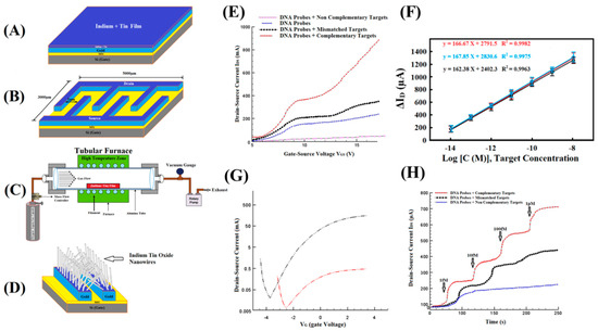 The development of a FET device using ITO nanowires. (A) The gold film was covered with an indium and tin film. The P-Type semiconductor that serves as the back-gate electrode is the Si platform (SiO2 layer). (B) E-beam lithography was used to form the electrodes and FET design. (C) A diagram of a tubular furnace. (D) The under-controlled production of NWs in a tube furnace. (E) IDS–VGS graphs from a synthesized transistor of ITO NWs after immobilizing probes; VDS was set to a value of +3 V. (F) The transfer properties were toggled from on to off before hybridization (red curve) and after (black curve), with VDS = +3 V. The lowest limit of detection was 1 fM in (G) the link between current changes and concentration. Regarding the DNA biosensor’s consistency and repeatability across three (blue line) and five weeks (black line); after three and five weeks, respectively, it reached 98% and 96% of its initial response. The dynamic evaluations of the FET biosensor. (H) The sensor’s dynamic tests use mismatched, non-complimentary, and complementary targets. At VDS = +1 V and VGS = +2 V, the ITO NWs reaction and expected outputs were obtained. Reproduced with permission from [49]. Copyright 2018 Elsevier.