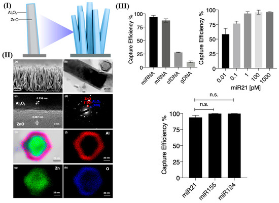 (I) ZnO/Al2O3 core–shell nanowire schematic illustrations; (II(a–h)) SEM and TEM images of the nanowire—atomic-resolution TEM images of the nanowire showing orientation growth of (100) ZnO and (110) Al2O3; and (III) Capture of miRNAs on annealed ZnO/Al2O3 core–shell nanowires, comparison of the nucleic acids’, miRNAs’, mRNAs’, cfDNAs’, and gDNAs’ capture efficiency. Capture efficiency of miR21 on nanowire at concentrations of 0.01, 1, 10, and 1000 pM; comparison of miR21, miR155, and miR124 capture efficiencies. Error bars for a set of measurements (n = 3) display the standard deviation. Reproduced with permission from [35].
