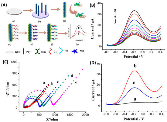 (A(a–g)) Diagrammatic representation of the improved sensor manufacture using PEG/PPy NWs and antifouling properties. A plain GCE, PPy/GCE, aPEG/PPy/GCE, C1/PEG/GCE, MB/C1/PEG/GCE, T2/MB/C1/PEG/GCE, and DPV result are examples of outcomes. (a) bare GCE (b) PPy/GCE (c) PEG/PPy/GCE (d) C1/PEG/GCE (e) MB/C1/PEG/GCE (f) T2/MB/C1/PEG/GCE (f) DPV results (B) Common DPV spectra for the incubation of MB/C1/PEG/PPy/GCE with various target miRNA concentrations (10−15 M–10−7 M) are shown in order from top to bottom. (C) Electrochemical Impedance Spectroscopy (EIS) data were captured at the following locations: GCE (a); PPy/GCE (b); PEG/PPy/GCE (c); C1/PEG/PPy/GCE (d); and T2/C1/PEG/PPy/GCE (e). DPV characterization of MB/C1/PEG/PPy/GCE recorded before (curve b) and after (curve c) target miRNA (T2) hybridization is shown in (D) together with the C1/PEG/PPy/GCE DPV curve (black line a). Reproduced with permission from [34]. Copyright 2019 Elsevier.