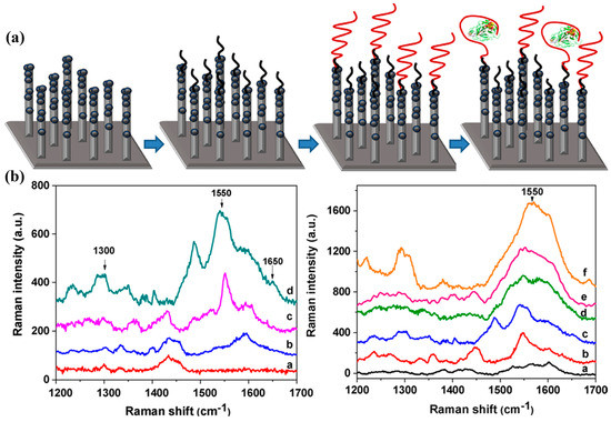 Awatef reported developing a novel aptasensing substrate powered by SERS for the highly accurate and focused detection of prostate-specific antigen (PSA). Vertically aligned silicon nanowires (SiNWs) coated with silver nanoparticles (AgNPs) make up the transducing SERS substrate (Figure 9). The aptamer is immobilized using thiol chemistry and the Raman signal is enhanced by the silver nanoparticles. Only if the aptamer is present on the surface of SiNWs does the presence of PSA cause the emergence of amide bond vibration modes. The platform is sensitive, specific, and selective to PSA in a broad concentration range from 0.1 to 20 g·L−1 with a detection limit of 0.1 g·L−1, which includes the blood serum range of both healthy participants and ill patients [56].