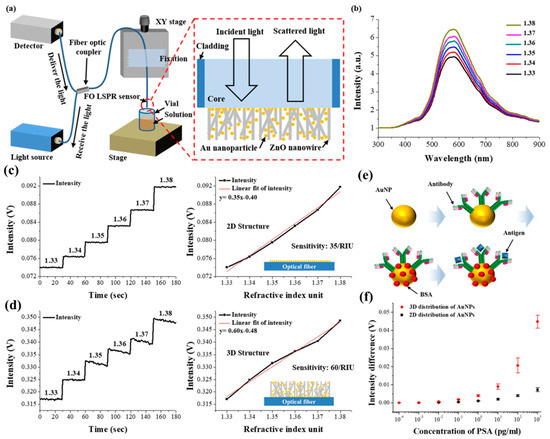 Localized surface plasmon resonance (LSPR) spectra measured with the suggested sensor are shown in a schematic picture together with the optical system: optical fiber−based measurement set-up (a) and 3D FO−LSPR sensor-measured spectra for solutions with various refractive indices (b). Comparison of 2D and 3D structures’ refractive index sensitivities for solutions with various refractive indices; diagram showing the interaction between an antibody and an antigen and the results of measurements in 2D (c) and 3D (d) structures. (e) Immunoassay procedures and (f) the variations in intensity seen using each sensor in response to different PSA values. Reproduced with permission from [57]. Copyright 2019 Nature portfolio.