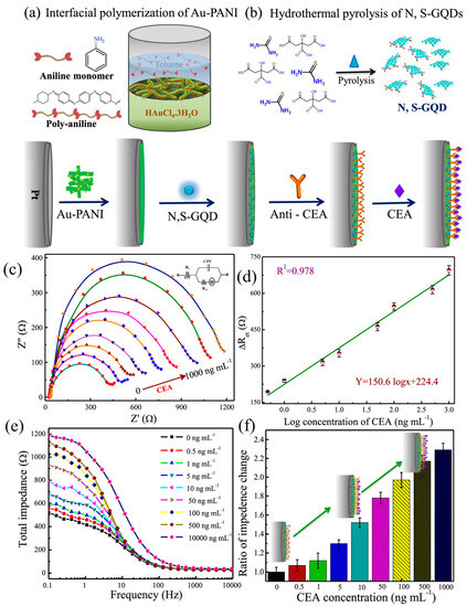 The schematic for the production of (a) electrochemically impedimetric immunosensor with no labels; (b) N, S−GQD hydrothermal pyrolysis, and interfacial polymerization of Au-PANI; (c) Nyquist plot of Pt||PANI−Au/N,S−GQDs/anti-CEA at different concentration of CEA (0–1000 ng mL−1); (d) standard curve for the identification of CEA; (e) the impedance before and following exposure to different CEA concentrations; and (f) proportion of alteration in impedance concerning the bare Pt||PANI−Au/N,S−GQDs/anti-CEA without CEA (0.1 Hz). Reproduced with permission from [58]. Copyright 2019 Nature Portfolio.