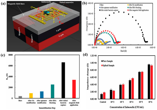 (a) The force analysis schematic for the NiNW in the magnetic field and (b) Streptavidin, biotinylated aptamers, BSA, and nickel bacteria at a concentration of 105 CFU/mL on the surface of the microelectrode and the application of the arc magnetic field were successively modified. The Nyquist plots after these modifications: (c) the change in the electron transfer resistance and (d) the detection of Salmonella in chicken carcass using this aptasensor (N = 3). Reproduced with permission from [62]. Copyright 2020 Elsevier.