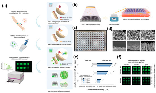 (a) Schematic depiction of the SARS-CoV-2 antibody detection procedure employing the ZnO-NW MP. Four steps make up the ZnO-NW MP-based method for detecting SARS-CoV-2 antibody responses in COVID-19 patients; (b) Graphic depiction of the modified ZnO-NW produced using a hydrothermal process, which involves sputtering as a seeding technique, shaking the ZnO-NW precursor solution during conduction heating, and then developing the material; (c) Growth of ZnO-NW MP produced using polystyrene microplate; (d) SEM pictures of ZnO-NWs were synthesized in a microplate for 1, 3, and 5 h. SARS-CoV-2 NP antigen is introduced to the ZnO-NW MP’s surface, and anti-SARS-CoV-2 NP IgG antibodies are found there; (e) Both the ZnO-NW MP and the MP were coated with SARS-CoV-2 NP antigen (1, 3, 5 g mL−1) employing anti-human IgG coupled to Alexa 488 to measure the fluorescence intensity and image. * p < 0.01 versus NP antigen at 1 µg/mL and the same antibody concentration, ** p < 0.01 versus anti-NP IgG at 32 ng mL−1 and the same antigen concentration; and (f) the bound rabbit anti-SARS-CoV-2 NP IgG polyclonal antibody (32, 160, 800 ng m L−1). Reproduced with permission from [70]. Copyright 2022 Wiley.