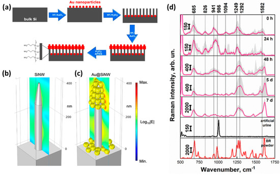 (a) A schematic illustration of how Au@SiNWs substrates are developed and then have their surfaces modified. Distribution of the tested electric field when it is ordinarily incident on either (b) a periodic SiNW or (c) a periodic Au@SiNW substrate. The color represents the log10(E) value, where E is the vector of the electric field. For = 633 nm, calculations are performed. (d) BR powder Raman spectrum, average SERS spectrum of artificial urine, at a concentration of 5 × 10−5 M in artificial urine for Au@SiNWs at various times (0−7 days) after BR adsorption. The standard deviations derived from spectra are indicated by the shading of gray in the average spectra. Reproduced with permission from [33]. Copyright 2021 ACS.