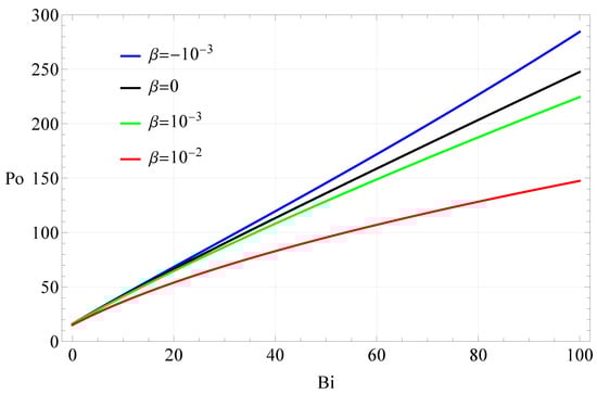 To summarize the results on the friction factor, the Poiseuille number was plotted as a function of the Bingham number for different values, as shown in Figure 3. Because , at a constant Reynolds number, the plot of Po vs. Bi shows the influence of on friction factor, . As anticipated, the discrepancies from the linear relationship between Po and Bi, where the relationship is based on the Bingham model, are indicated by the parameter. For the shear-thickening case, , we have and there is more friction. In the case of shear-thinning behavior, , we have , and as we increase , the value of friction factor decreases for the same Bingham number.