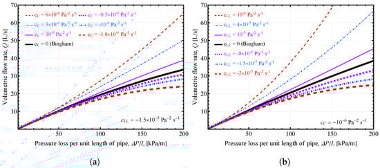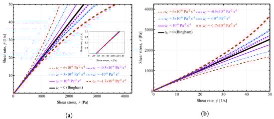 which also has three parameters: yield stress, , plastic viscosity, , and a second-order coefficient, , that describes the deviations from the linear relation between shear stress and shear rate as described by the Bingham model in Equation (1). For , the modified Bingham model shows a shear-thickening behavior, and for , the model displays a shear-thinning behavior. Similarly, for , the modified Bingham model reduces to the Bingham model in Equation (1).