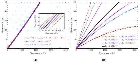 Influence of -parameter of the bulk concrete: (a) on shear rate vs. shear stress curves predicted by the Parabolic model; (b) on shear stress vs. shear rate curves predicted by the Parabolic model. Unless otherwise specified in the figure, the following values were used: , , , .