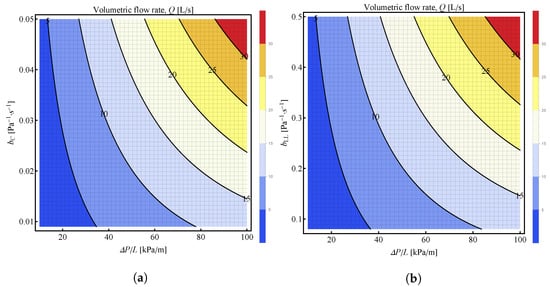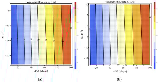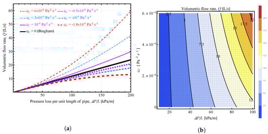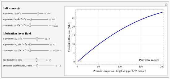 To facilitate applications of our theoretical results in practice, a demonstration application using the Wolfram Mathematica software (version 13.2) has been developed, with a sample graph shown in Figure 11. Users can manipulate the values of the rheological parameters for both bulk concrete and the lubrication layer of the fluid, the diameter of the pipe, and the lubrication layer thickness within the ranges of values written in the program. The resulting graph shows the total volume flow rate vs. the pressure loss per unit pipe length. Furthermore, the application can be used for the analysis purposes of the relation on how the parameters of the bulk fluid, the lubrication layer, the pipe diameter, and the lubrication layer thickness influence the resulting curve.