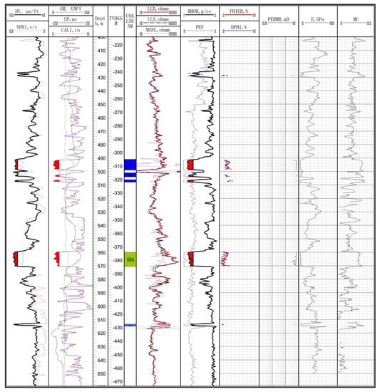 Figure 2 shows the logs and log interpretation results of porosity (PHIER and DPHI), permeability (PERMR), Young’s modulus (E) and the Poisson ratio (v). PERMR is the permeability, RHOB is the bulk density log, PHIER is the total porosity under reservoir conditions, and DPHI is the density porosity.