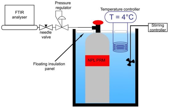 The stability of gas standards D (Table 1) was monitored over 1 week at low temperature (5 ± 1 °C). The cylinder was immerged in a water tank with a cooling system set at 4 °C (Figure 1). The gas cylinder was connected to the Fourier-transform infrared (FT-IR) spectrometer for the whole duration of the test.