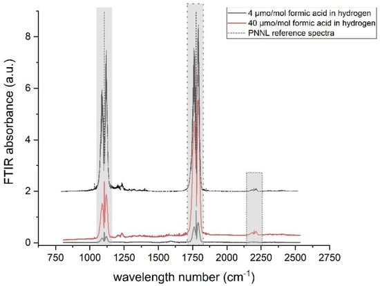 The RMs produced at 4, 40 and 100 µmol·mol−1 of formic acid in hydrogen were validated against FT-IR spectra (PNNL FT-IR database [24]). The comparison between the FT-IR spectra and experimental spectra confirmed that formic acid was present in the gas phase (see Figure 2). There was also visible trace of water vapour in the spectra, which may be attributed to residual water vapour in the sampling system and/or to the pure formic acid source that contained trace of water as a stabilizing agent.