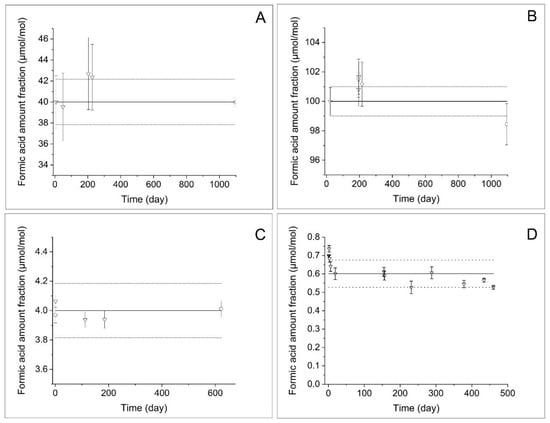 The stability study of sub-µmol·mol−1 formic acid in hydrogen was limited by the measurement method capacity; therefore, a study at 0.2–0.4 µmol·mol−1 was attempted, but the measurement uncertainty reached 5–10% (k = 1). Due to the complexity of preparing these gas standards, an isochronous study was not performed as the large uncertainties precluded the detection of any stability variation; therefore, the study at 0.7 µmol·mol−1 in Figure 3D represented the lowest amount fraction in this study. The first observation is the quick decay in less than 20 days from 0.7 µmol·mol−1 to 0.6 µmol·mol−1. After this quick initial drop, the value stabilized and decayed slowly over time. The quick decay was considered an initial reaction time between the gas container surface and the gas mixture, resulting in a small adsorption of formic acid onto the cylinder wall. Therefore, the stability study was only considered from day 20 to 460. No outliers were observed using Grubb’s test at the 95 and 99% confidence levels in all study. The slope of the linear regression was significant at the 95% confidence level. Its decrease was consistent with a slow decay. For a given shelf life of 1 year, the relative stability uncertainty was estimated at 6.2% (k = 1), including the decay rate. Considering the initial drop and the following slow decay, it is therefore possible to certify the gas standard for formic acid in hydrogen at sub- µmol·mol−1 level if the value is certified against a traceable measurement 20 days after the preparation of the reference material.