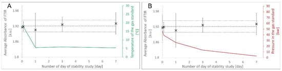 The evolution of the formic acid amount fraction in hydrogen was monitored over time using FT-IR and SIFT-MS. As described above, cylinders of formic acid in hydrogen of different ages were analysed over two consecutive days (isochronous study) as shown in Figure 3A–C.