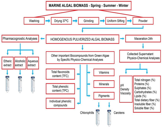Three extracts were obtained from dried samples of algae with different solvents: ether extract solution (A); alcohol extract solution (B); and water extract solution (C) [39,40]. Pharmacognostic analysis was performed for each extract via specific physicochemical methods as shown in the design process (see Figure 2). Each extract was then analyzed to identify the active principles. The process design for the analysis of biocompounds of interest (secondary metabolites) in green algae from the littoral zone of the Romanian Black Sea is shown in Figure 2.