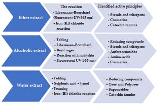 Based on physicochemical methods used in phytochemical studies, we conducted a pharmacognostic study in order to identify the classes of bioactive compounds that can be found in three representative green seaweeds species from the Black Sea coast, Cladophora vagabunda, Enteromorpha intestinalis, and Ulva lactuca. The importance of these intuitive analyses represents the possibility of focusing on the secondary metabolites of algae. The chemical methods used for each extract on the three solvent classes—ether, alcohol, and water—are emphasized in the scheme in Figure 2. The specific physicochemical reactions leading to the identification of the important active principles are emphasized in Figure 3 [27,35].