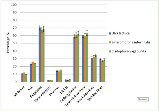 The algal biochemical composition was determined by highlighting moisture and ash, establishing the sulphate, protein, lipid, carbohydrate, oligosaccharides, polysaccharides, and dietary fiber content for each type of algae.