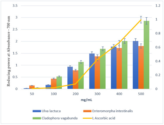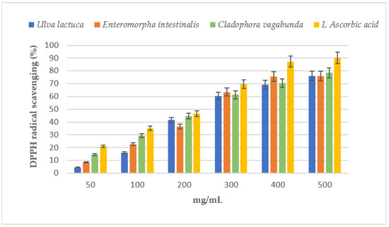 where Asample is the sample absorbance after 30 min for the algae extract, and DPPH absorbance without algae is represented by Acontrol. The positive control was ascorbic acid, and the absorbance of the blank sample is indicated as Ablank.