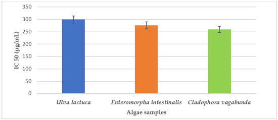 In terms of moisture and ash, Enteromorpha intestinalis had the highest moisture (11.98 ± 0.84%) and ash content (25.65 ± 0.98%), and Cladophora vagabunda had the lowest moisture (9.78 ± 0.56%) and ash content (24.63 ± 0.84%). These results are similar to the results obtained by Rohani-Ghadikolalel et al., Metin et al., and Turan et al. [44,69,70]. From the pharmacognostic study (Figure 3) and the biochemical composition analysis of the studied algal material, the high carbohydrate content consists of sulphated and non-sulphated polysaccharides, and various oligosaccharides are noted. In the literature, studies have confirmed the existence of polysaccharides in green seaweeds, such as those reported by Hernández-Garibay et al. and Hentati et al. [71,72]. Sulfate-oligosaccharides from green algae have been reported by Liu et al. [73]. Figure 4 contains the results obtained from the elemental analysis.
