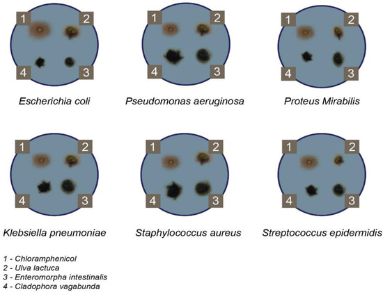 - Kolanjinathan, K.; Stella, D. Comparative studies on antimicrobial activity of Ulva reticulata and Ulva lactuca against human pathogens. Int. J. Pharm. Biol. Arch. 2011, 2, 1738–1744. Available online: http://www.ijpba.info/index.php/ijpba/article/view/496/345 (accessed on 1 May 2023).