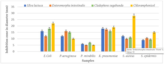 For the antibacterial activity, four Gram-negative species were used: Klebsiella pneumonia (ATCC 13883), Pseudomonas aeruginosa (ATCC 27853), Proteus mirabilis (ATCC 25933), and Escherichia coli (ATCC 25322). Two species of Gram-positive bacteria were also tested: Staphylococcus aureus (ATCC 25923), and Streptococcus epidermidis (ATCC 12228). Bacterial strains were grown in a nutrient agar medium at 37 °C. Nutrient agar medium consisted of 5 g of peptone, 3 g of beef extract, 5 g of NaCl, and 20 g of agar in distilled water. Bacterial suspensions were spread to achieve a uniform turf culture [66,67,68]. The antimicrobial activities of green algal hydroalcoholic extracts obtained in ethanol 70% were evaluated by means of the agar well diffusion assay with some modifications [67]. Antimicrobial activity was assessed by measuring the diameter of the circular inhibition zones in the well using the Kirby–Bauer diffusimetric method, and the values represent the means of three replicates [68]. The minimum inhibitory concentration (MIC) was studied with the measurement of the diameters of the inhibition zone made by the seaweed ethanolic extracts [38,68].